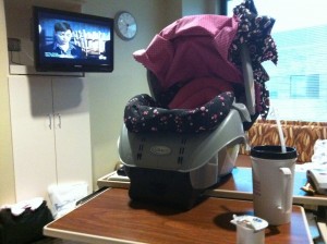 Today I am going home. Mommy, Nolan, Nanny & Papa Brad are taking me there. Papa Brad came in to our hospital room with my car seat and he was out of breath! Silly Papa Brad.. He brought in my entire car seat- base and all. He forgot about leaving the base in the car and only bringing in the detachable car seat.